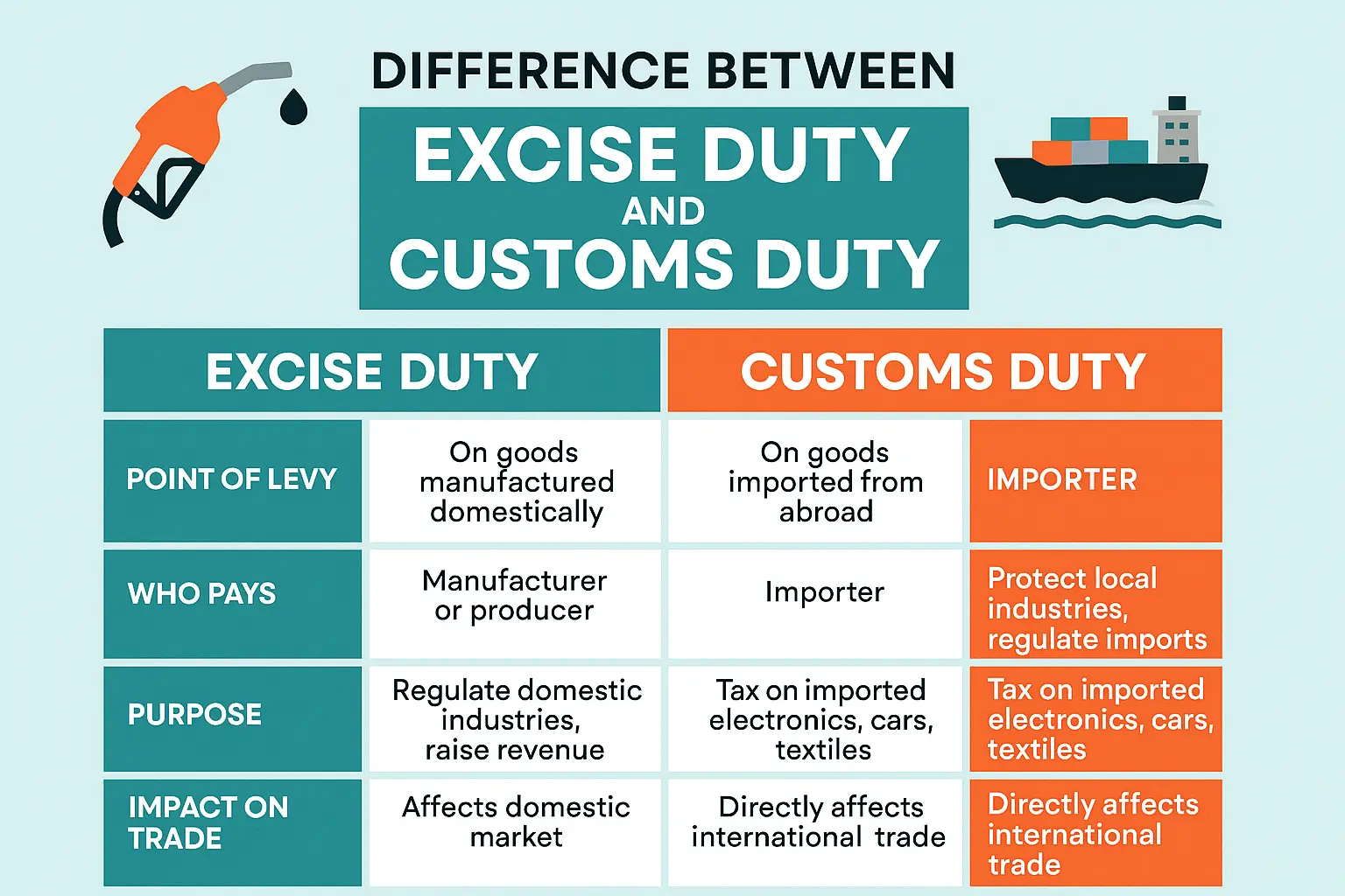 Understand the core differences between Excise Duty (domestic manufacturing) & Custom Duty (imports). Learn about who pays, when it's levied, & its purpose.