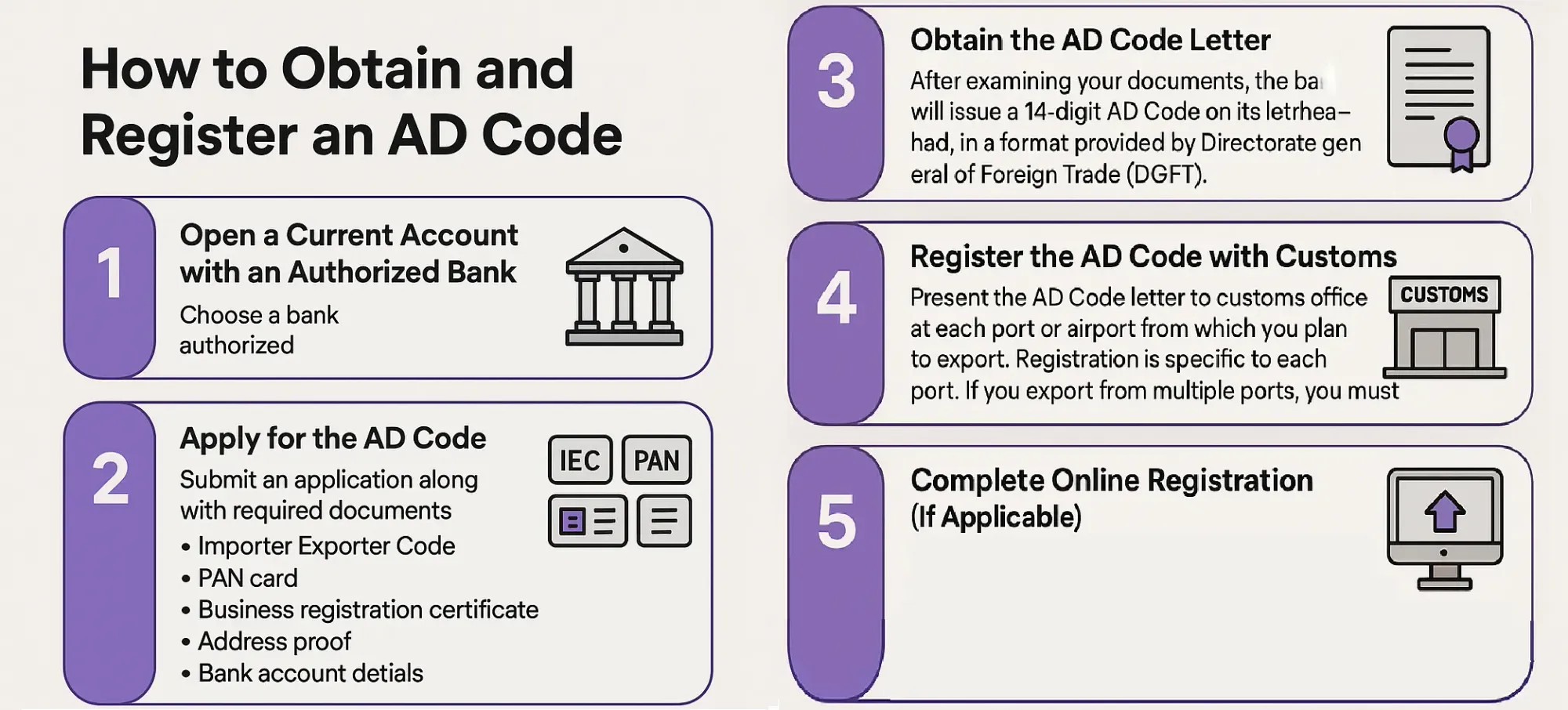 - Mandatory for Customs Clearance: You must register your AD Code at the port or airport of shipment in order to export goods from India.