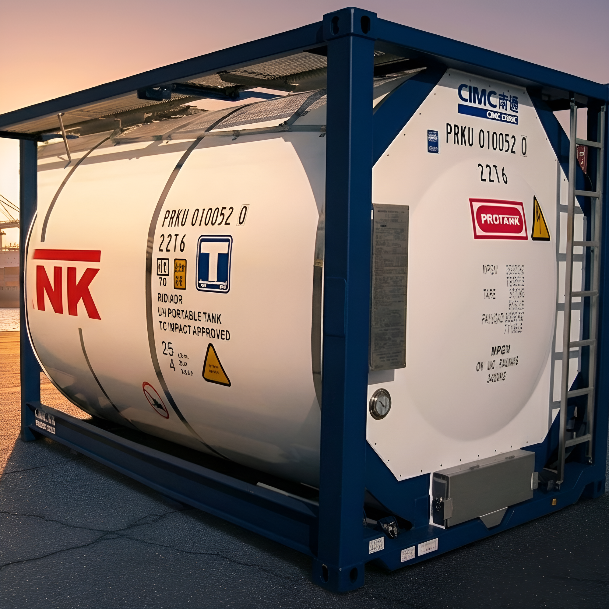 This is a specialized container that's basically a large tank built inside a steel frame, designed exclusively for transporting liquids. Instead of a box with doors, it has internal compartments with valves for top-loading and bottom-discharge of liquid cargo. You see these for transporting edible oils, chemicals, wine, milk, beverages, or any liquid that needs to move in bulk quantities. The tank can be food-grade stainless steel (for safe liquids like vegetable oil or juice) or industrial-grade steel (for chemicals or oils).