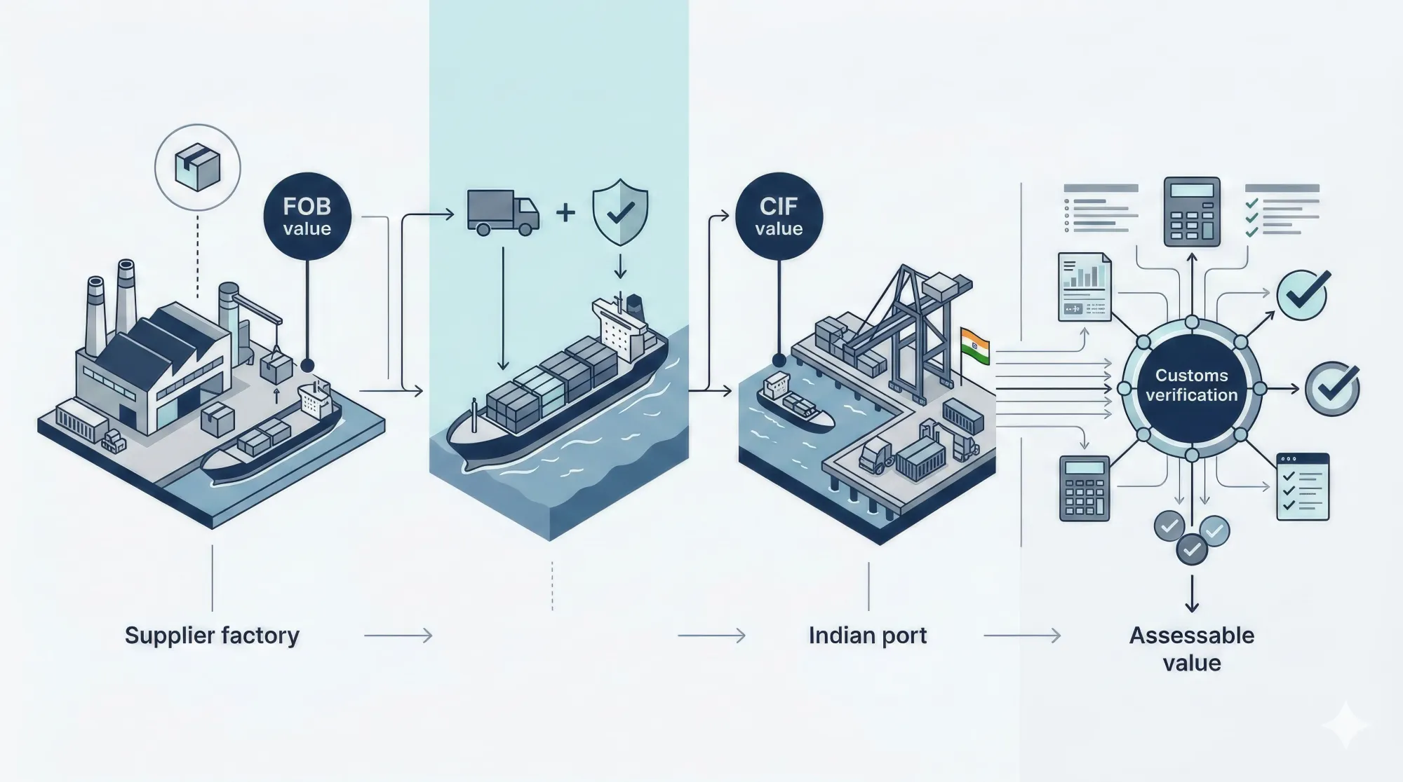 Indian customs always calculates duty on CIF‑based assessable value, even if your commercial contract is on FOB terms. This is why understanding CIF vs FOB and how to move from one to the other is crucial for correct duty estimation and avoiding penalties.