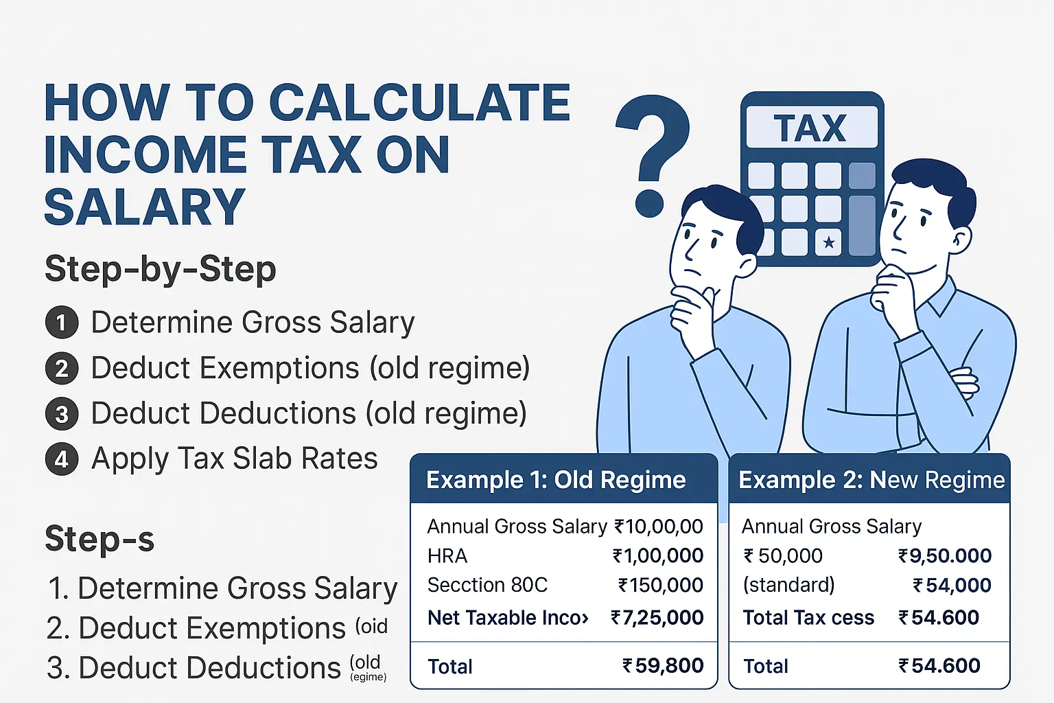 Learn how to calculate income tax on salary with simple examples under both the old and new tax regimes in India. A clear guide for salaried individuals