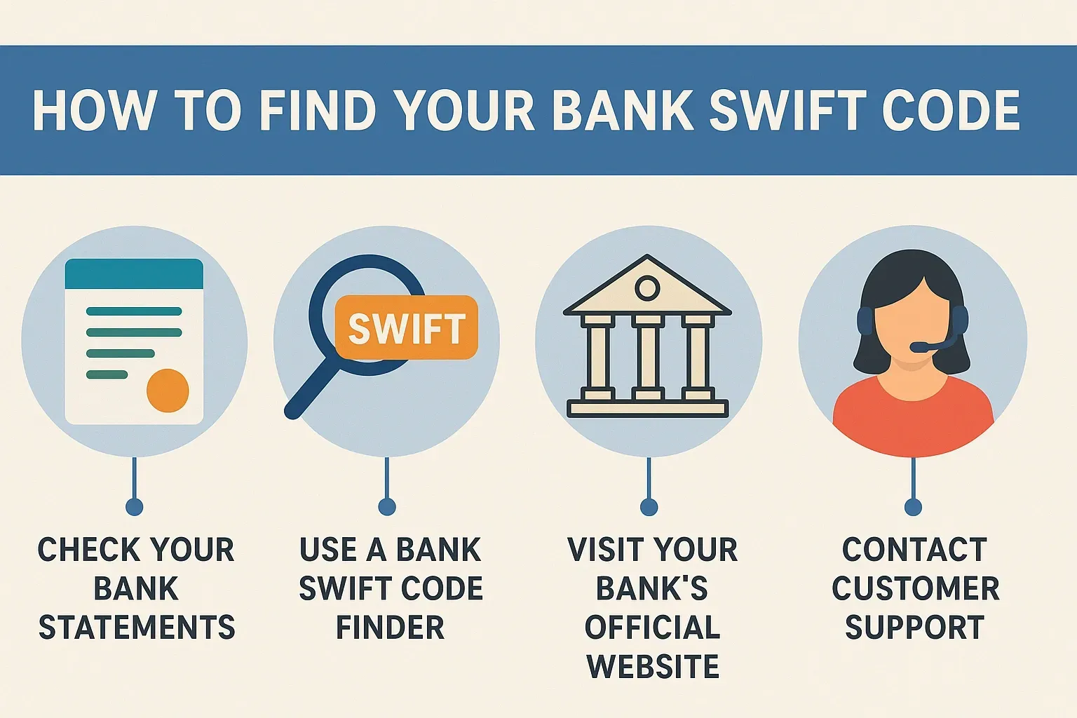 You can find your bank’s SWIFT code on your bank statements, through online banking, on the bank’s official website, or by contacting customer support.